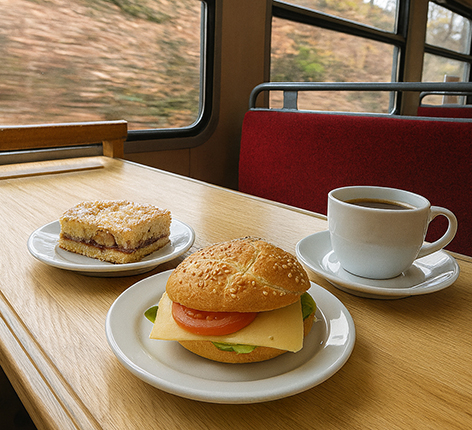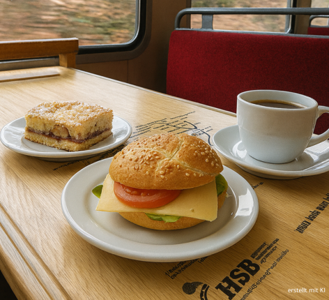 - Kleines Frühstück im Zug (1 Kaffee und ein belegtes Brötchen *)